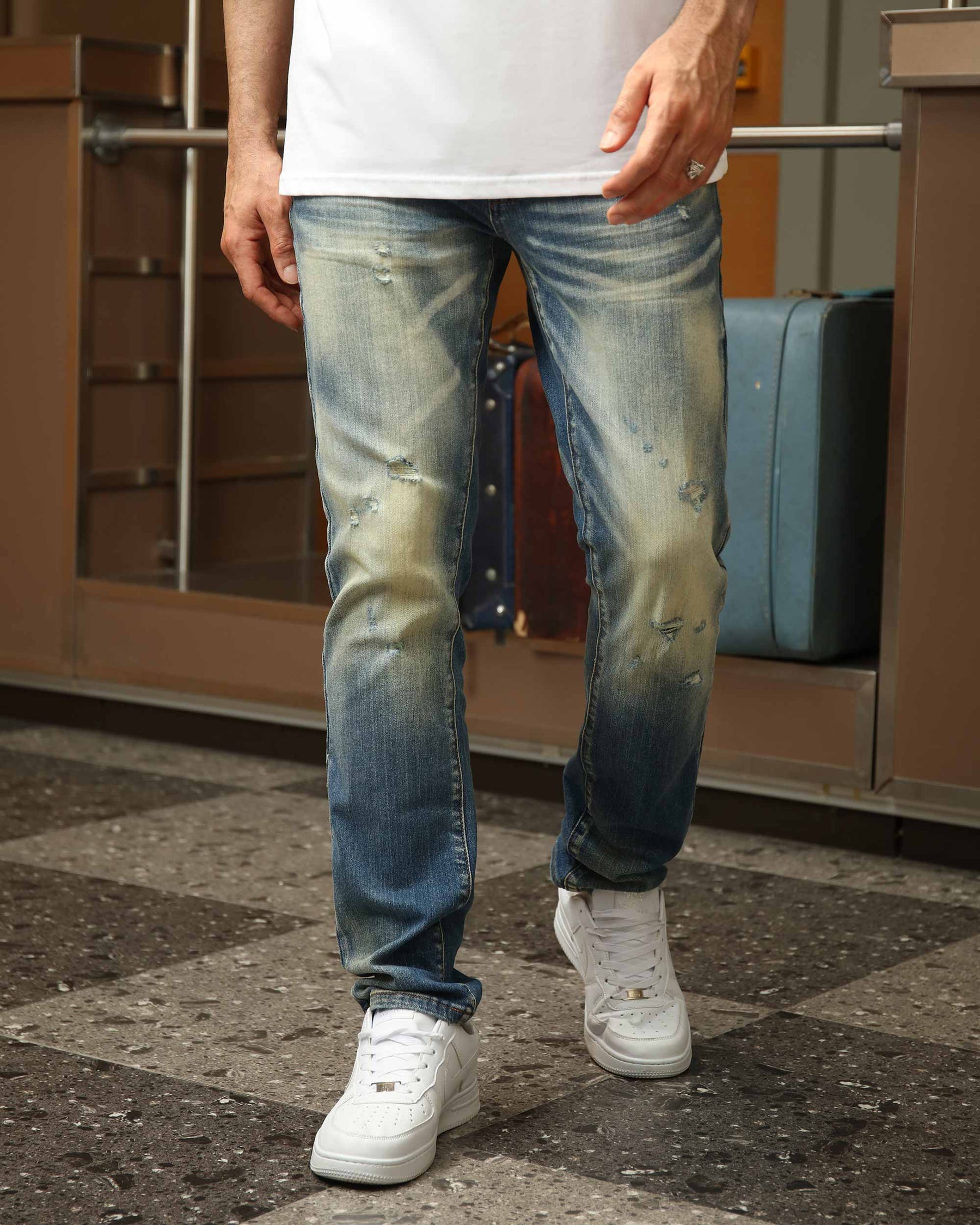 - Vaqueros Slim: Modernos y ajustados en caderas y muslos, con un poco más de espacio en las piernas. Elegantes y definidos sin ser demasiado ajustados, los vaqueros slim desgastados aportan un toque casual y elegante.