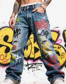 - Jeans con grafitis y salpicaduras de pintura: diseños inspirados en la moda urbana que dejan una impresión audaz.